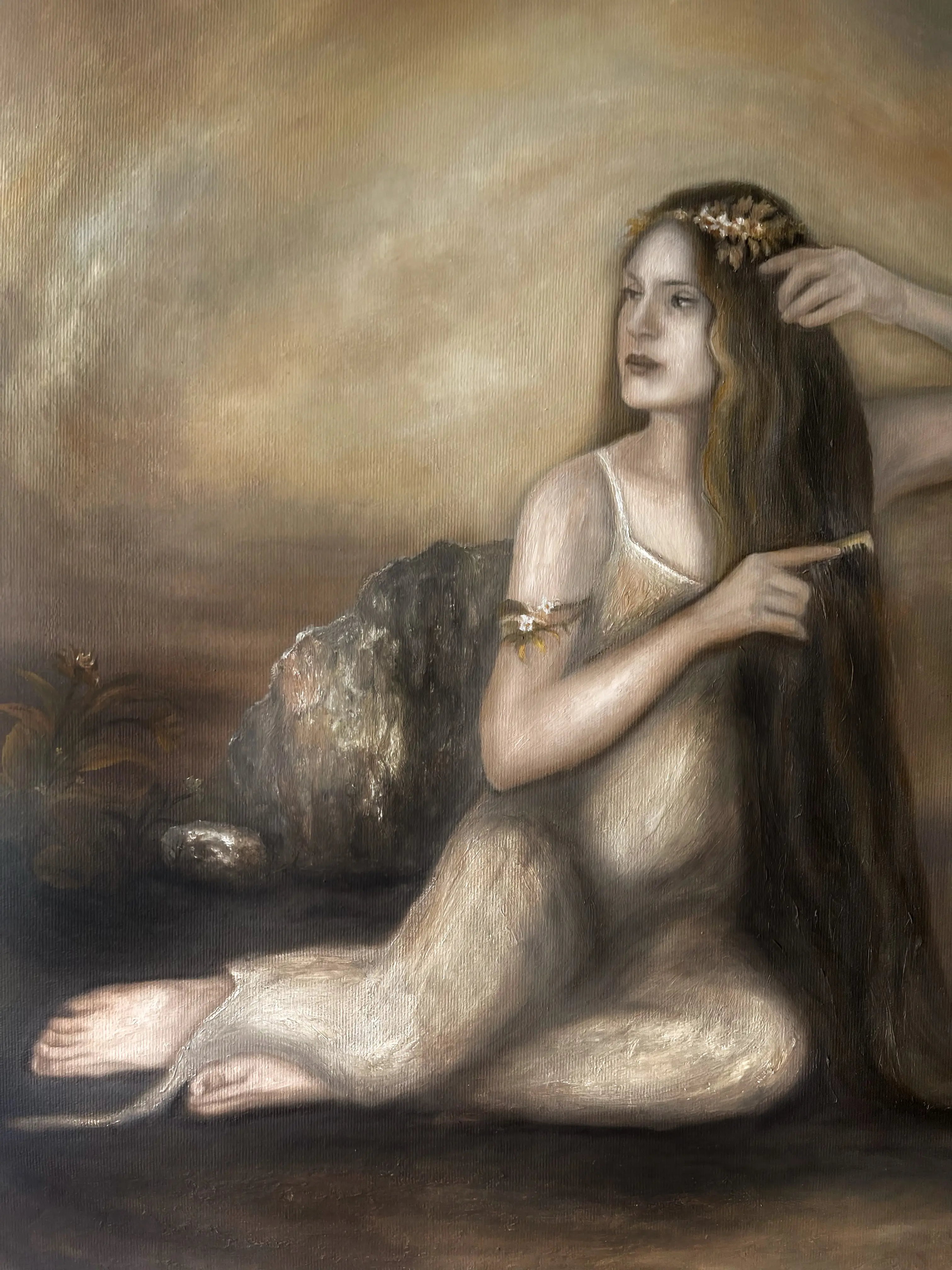 Kadim zamanların sessizliğinde, toprağın kalbinde oturuyor kadın. Saçlarını tararken, yalnızca kendini süslemiyor; her bir telinde geçmişin sesini, doğanın özünü, tanrıçaların mirasını yeniden uyandırıyor.