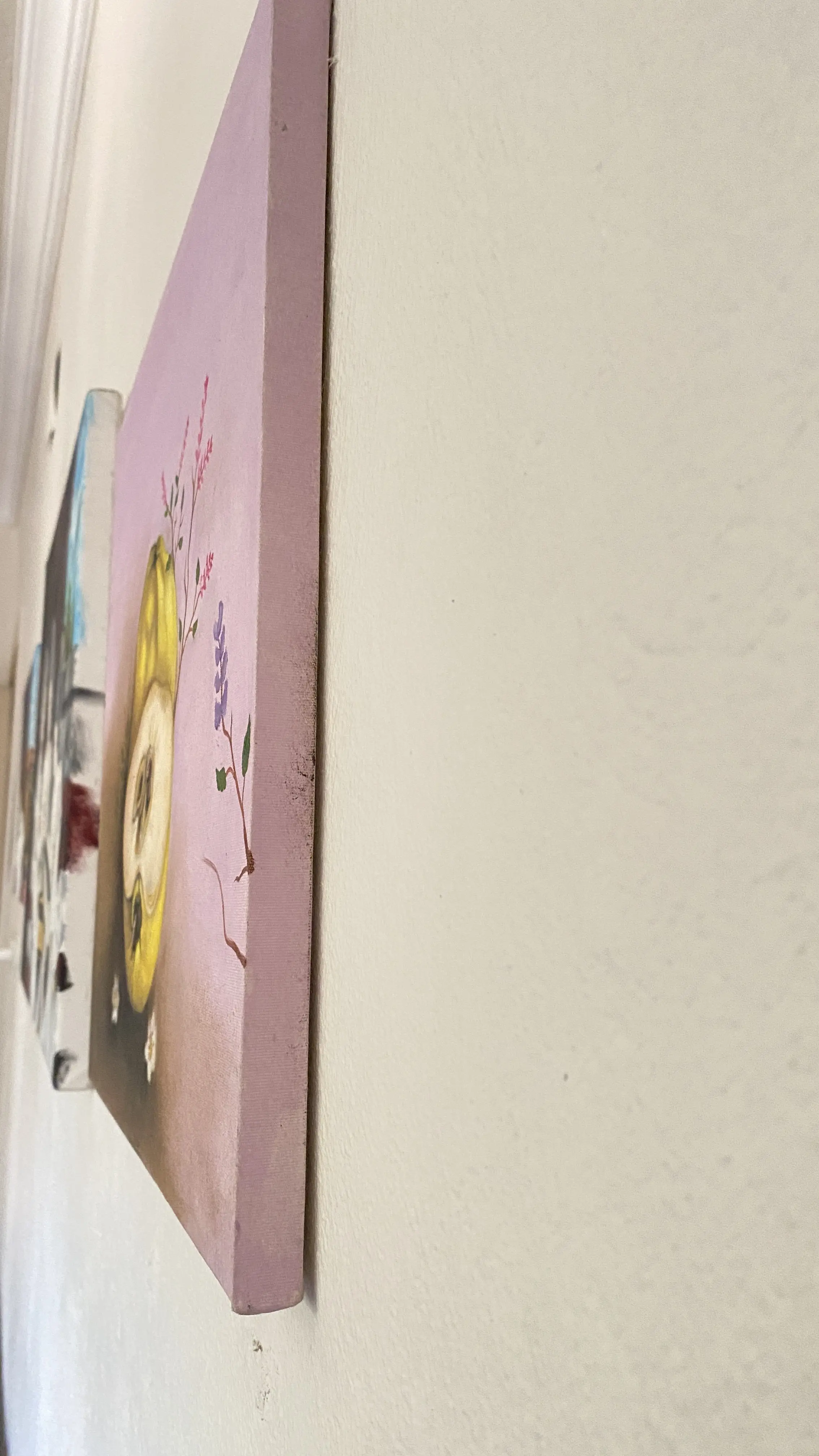40x40 tuval üstüne yağlı boya yapılışı 2024 yapılan bu eser umudun ayva meyvesi üzerinden değerlendirilmiş, yanda yeşeren mor çiçekler ölümün yeniden doğuşu üzerine eser tamamlanmış.