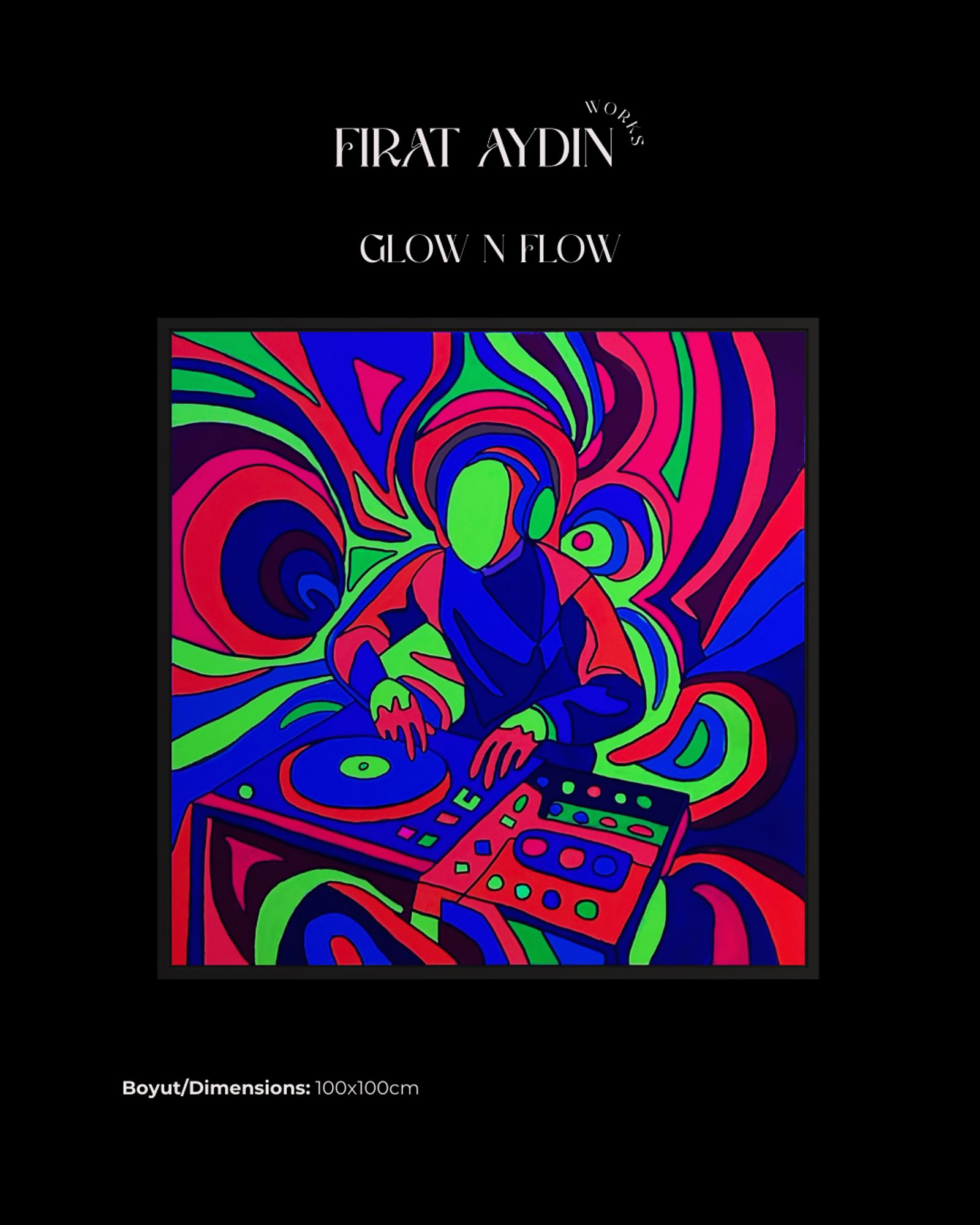 Glow N Flow (100×100 cm) müziğin ritmini çizgi ve renge çeviren neon bir soyut tablo. DJ kültüründeki “mix” fikri; konsantrik dalgalar, keskin kontürler ve UV’ye tepkili canlı renklerle görselleştirildi. Yüzün boş bırakılması kimliği değil akışı öne çıkarır; izleyici kompozisyonun içine çekilir ve adeta müziği gözle dinler. İstanbul merkezli sanatçı Fırat Aydın’ın grafik çizgi dili, dairesel plak formlarıyla grid yapılı mixer arasında güçlü bir denge kurar; hareket ve tempo hissi katman katman büyür.