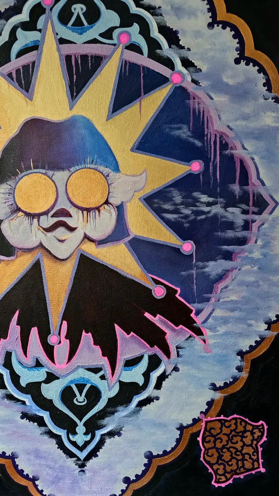 Eseri dolaşım tezyinî çerçeveyle, yalnızca estetik bir sınırlama değil, bilincin dışında, bilincin dışında temsil eder. Geleneksel motif burada bir süslemelerle ortaya çıkar, ruhun iç mimariye dönüşümü. Altın oranlarda kurulmuş bu mandala benzeri düzen, kaotik iç dünyanın merkezini arayan kişinin simgesidir.