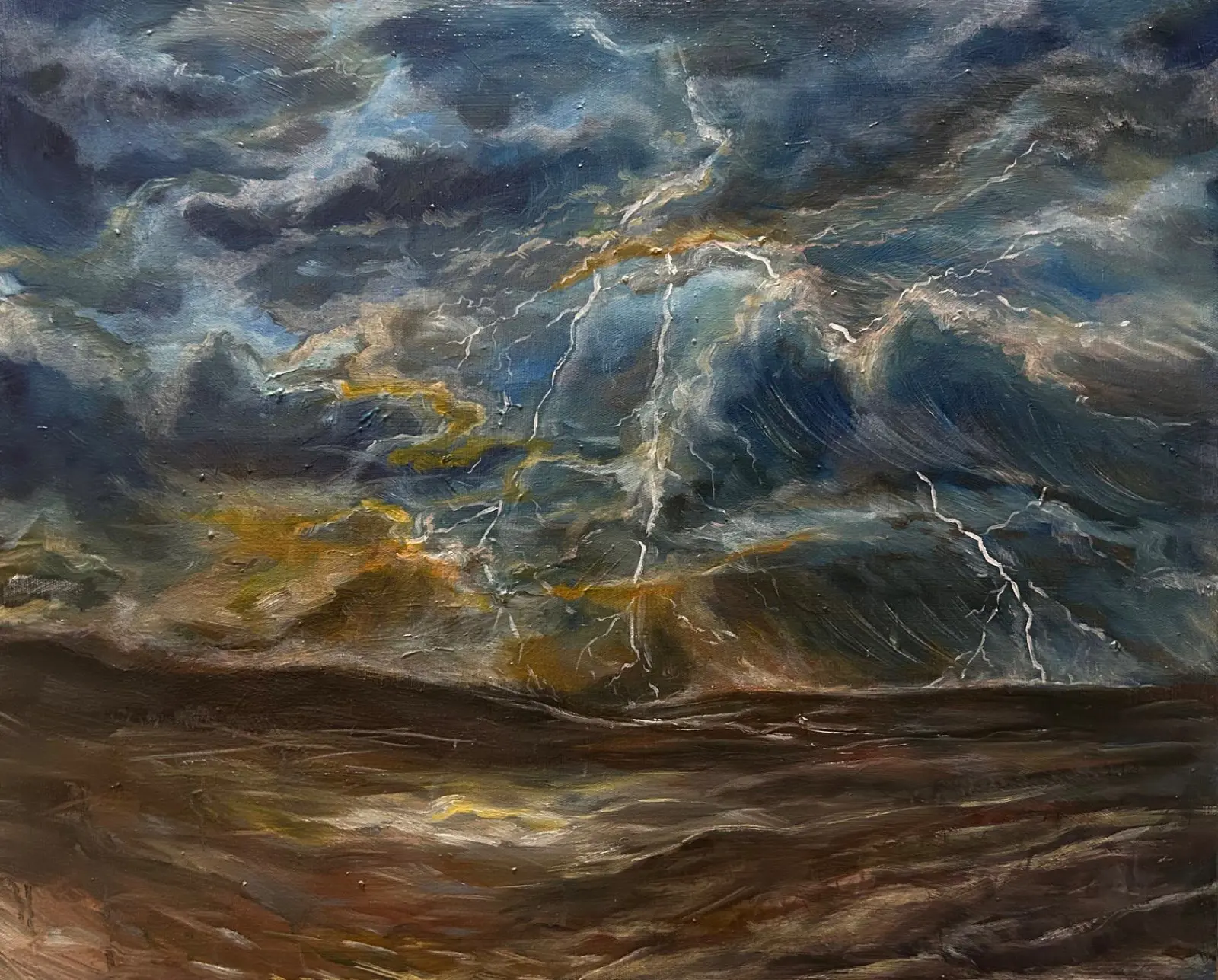 Bu eser, fırtınalı gökyüzüyle deniz arasındaki dramatik anı yakalıyor. Şimşeklerin kıvrak ve zarif çizgileri, dalgaların gücüyle uyumlu hareket halinde birbirini kışkırtıyor; gökyüzünün karanlığına karşı denizin parlak noktaları, sahneyi hem dinamik hem de sofistike kılıyor. Şimşeklerin adımları, doğanın güçlü akışını incelikli bir dansla ifade ediyor.