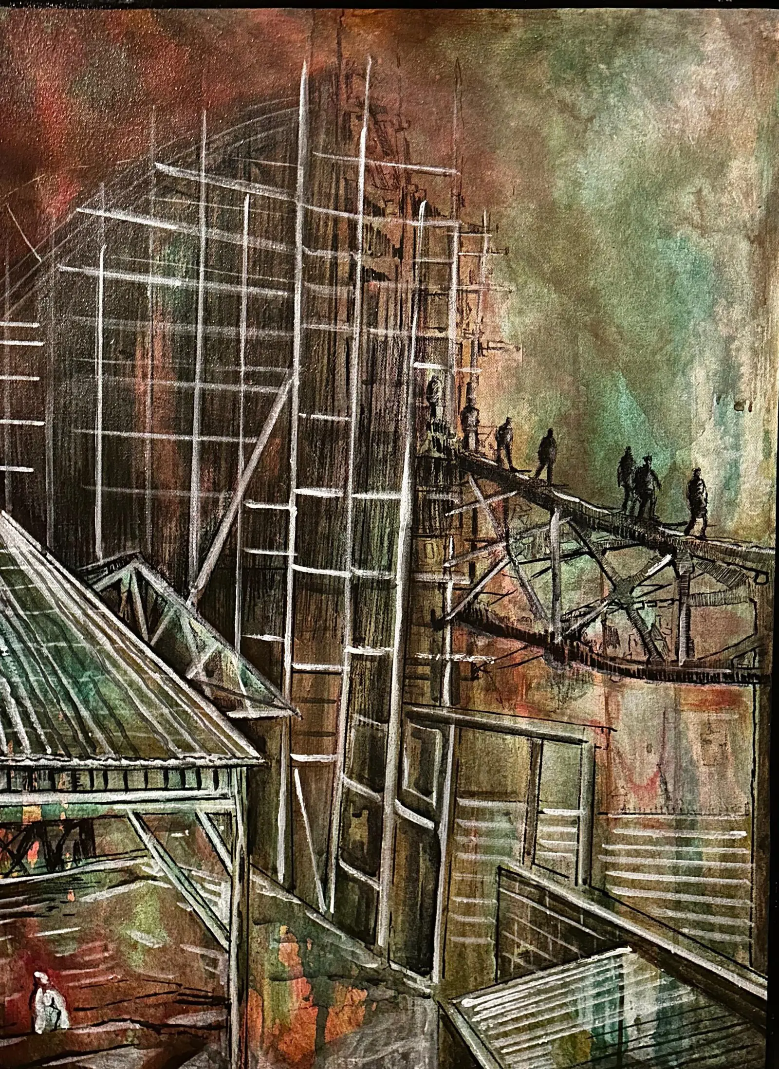 Bu eser, bir şantiye ve köprü yapımının gölgesinde yükselen metal iskeleler ile hafifleşen insan figürlerini betimler. Soğuk demir ve tuğla tonlarının arasında, ışığın kırıldığı noktalar gölgelerin derinliğini artırır; karmaşık çatılar ve iskelenin keskin hatları, mekana modernleşme ve yalnızlık duygusu katar. Gölgeler, yapının sertliğini yumuşatarak, insanın çabasını ve mekânla kurduğu ilişkiyi incelikli bir şekilde ortaya koyar.