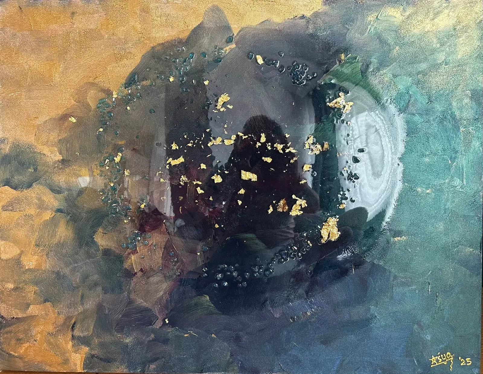Akrilik boya, epoksi, pigment, cam kırıkları ve altın varak ile soyut kompozisyon