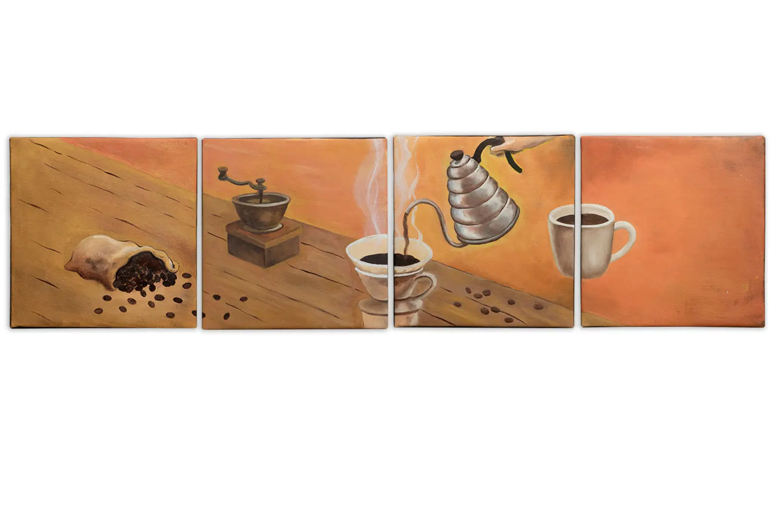 Kahvenin çekirdekten fincana dönüşümünü anlatan 4 parçalık yağlı boya set. Her biri 20x20 cm'lik tuvaller, sıcak tonlarla kahve yapım sürecinin tüm aşamalarını görsel bir hikaye olarak sunar.