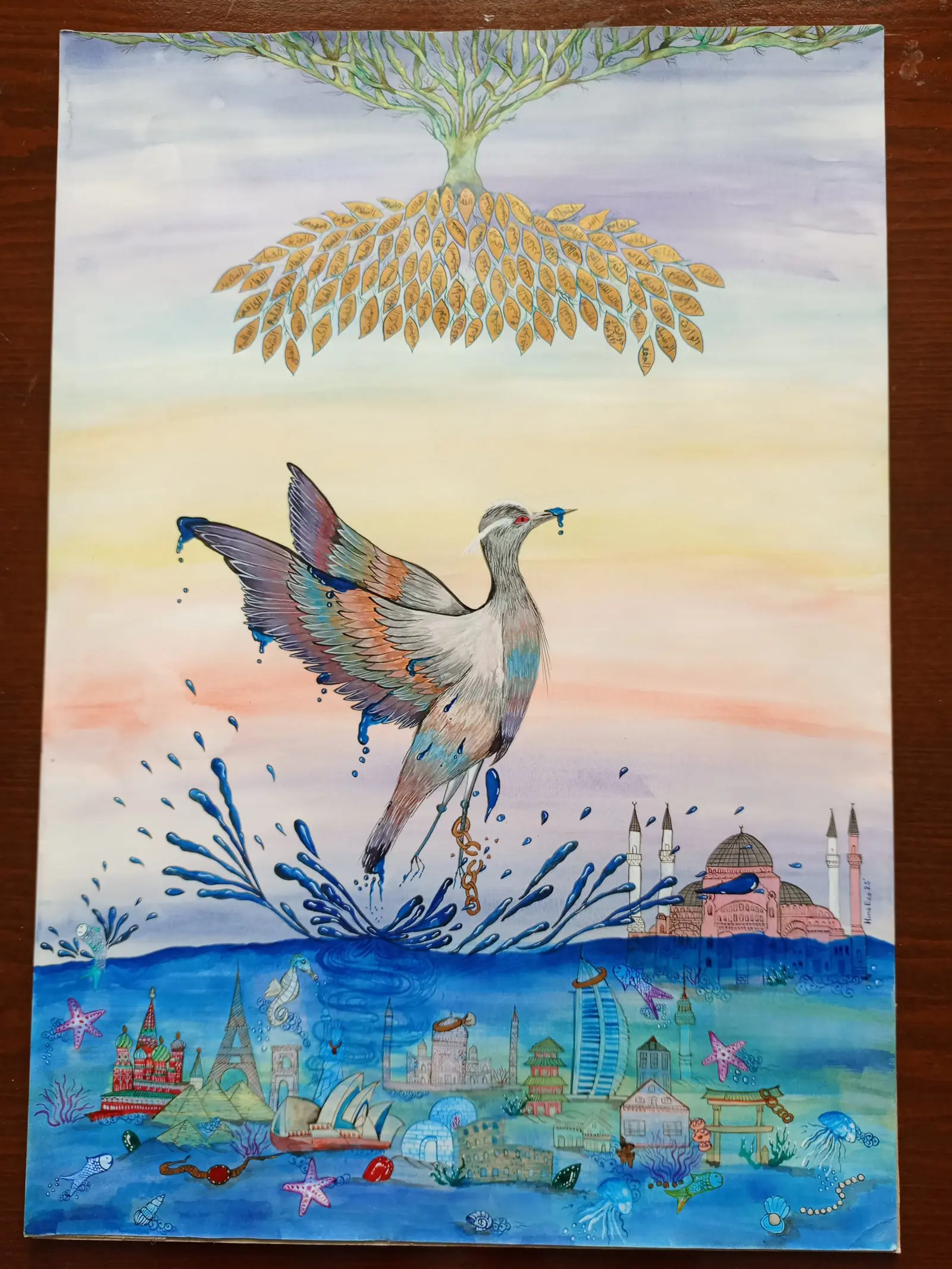 Suyun altında, tüm dünyadan ikonik binaları ve maddiyatı simgeleyen materyalleri çizdim. Türkiye için ikonik bir bina olan Ayasofya Camii’ni ise suyun üzerinde çizmemin sebebi, İslam’ın her daim bâki kalacağı ve asla batmayacağıdır.