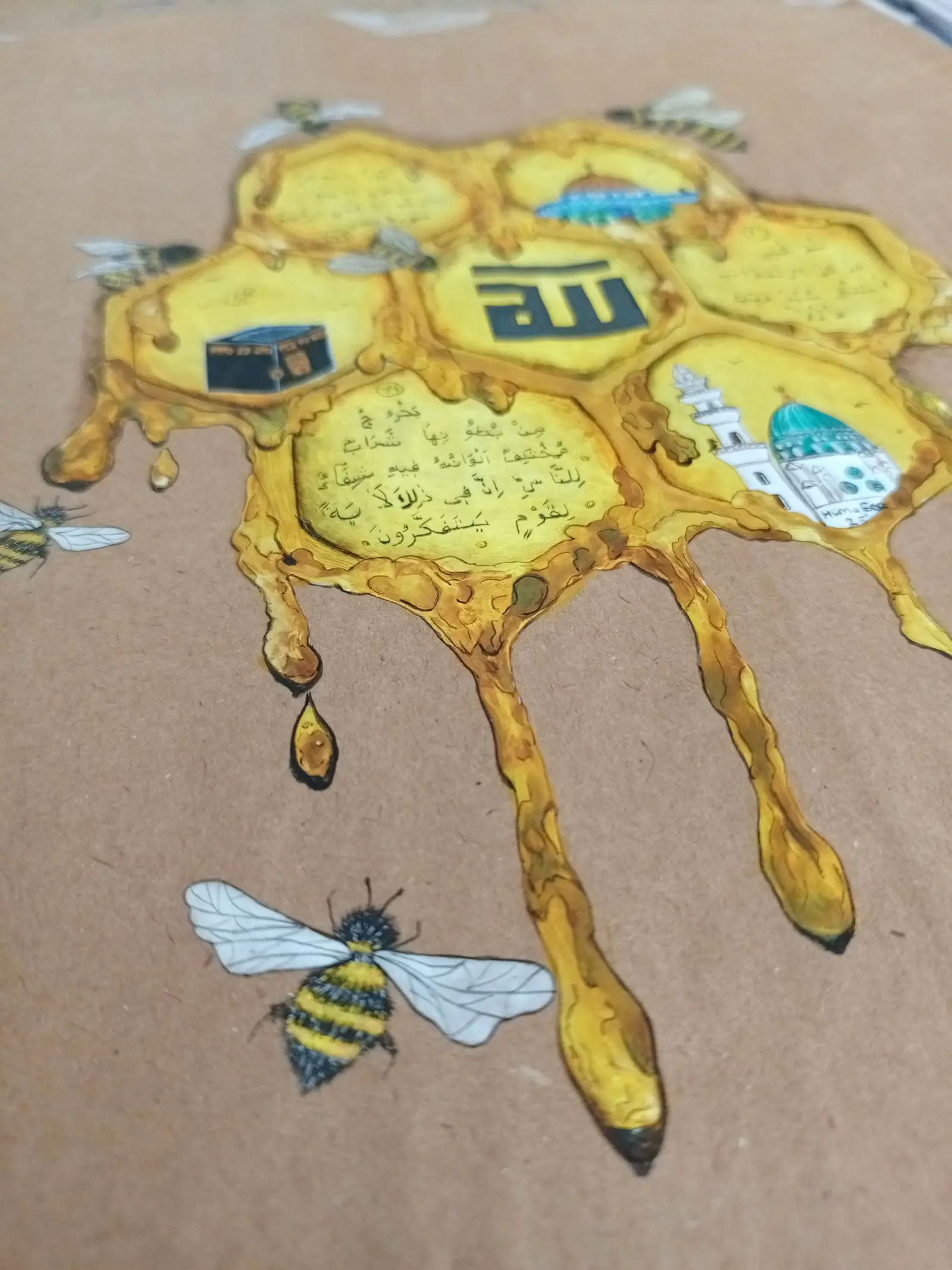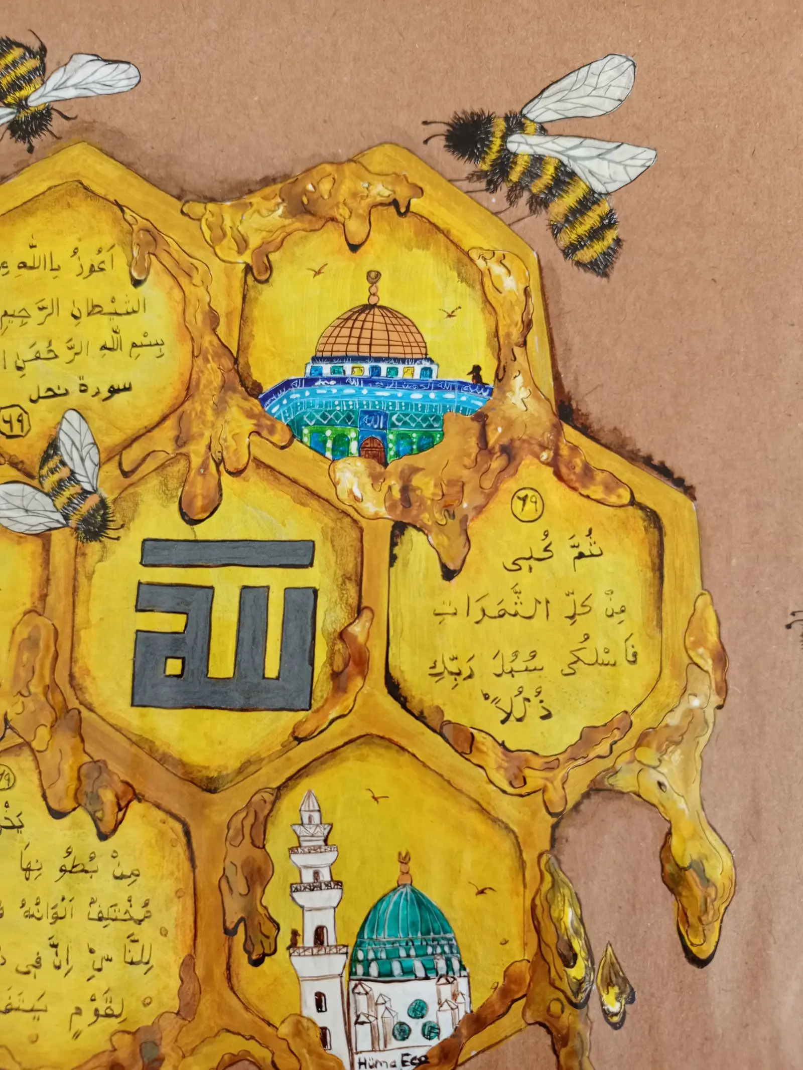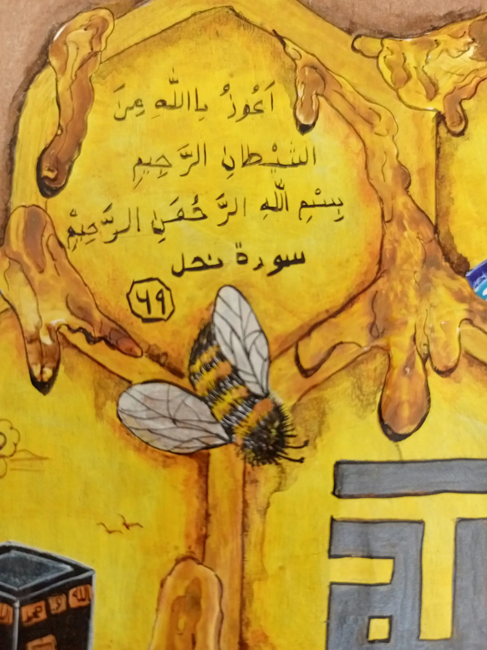 Balın şifasını anlatan bu ayet, insana hem bedenin hem de ruhun iyileşeceği kaynağı fısıldar. Bu eserimde, şifanın merkezine kalbin ilacı olan Allah lafzını yerleştirdim; etrafını ise, ruhun sükûn bulduğu mekânlarla çevreledim.