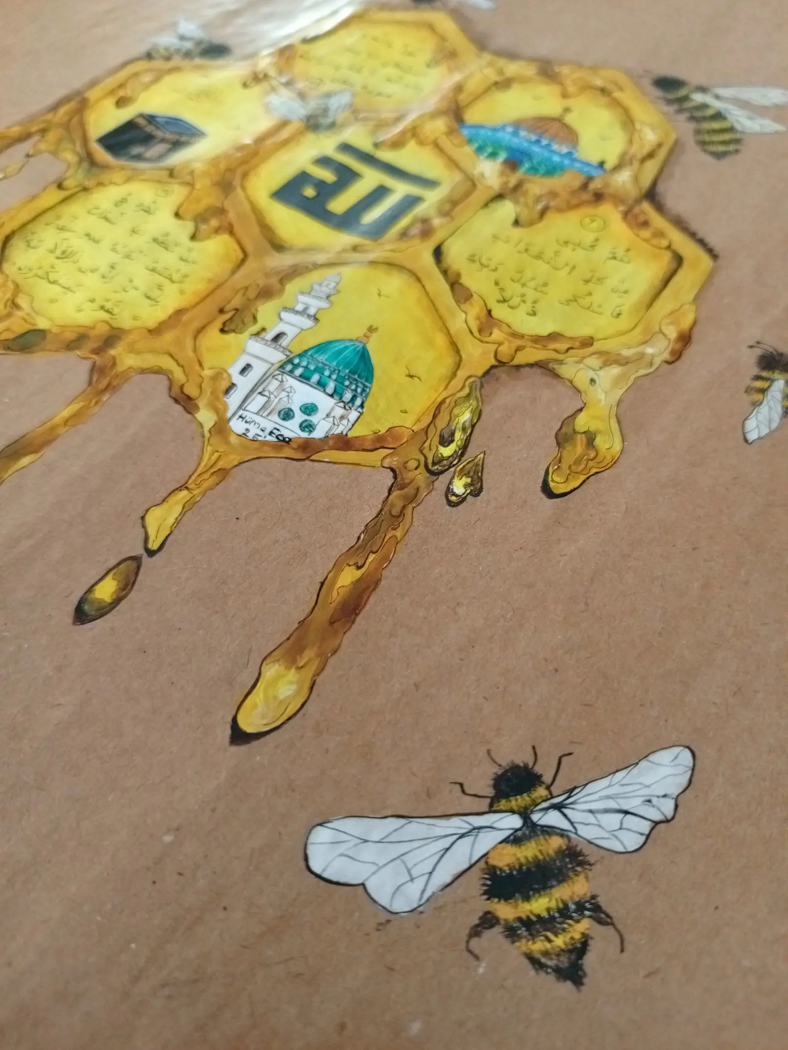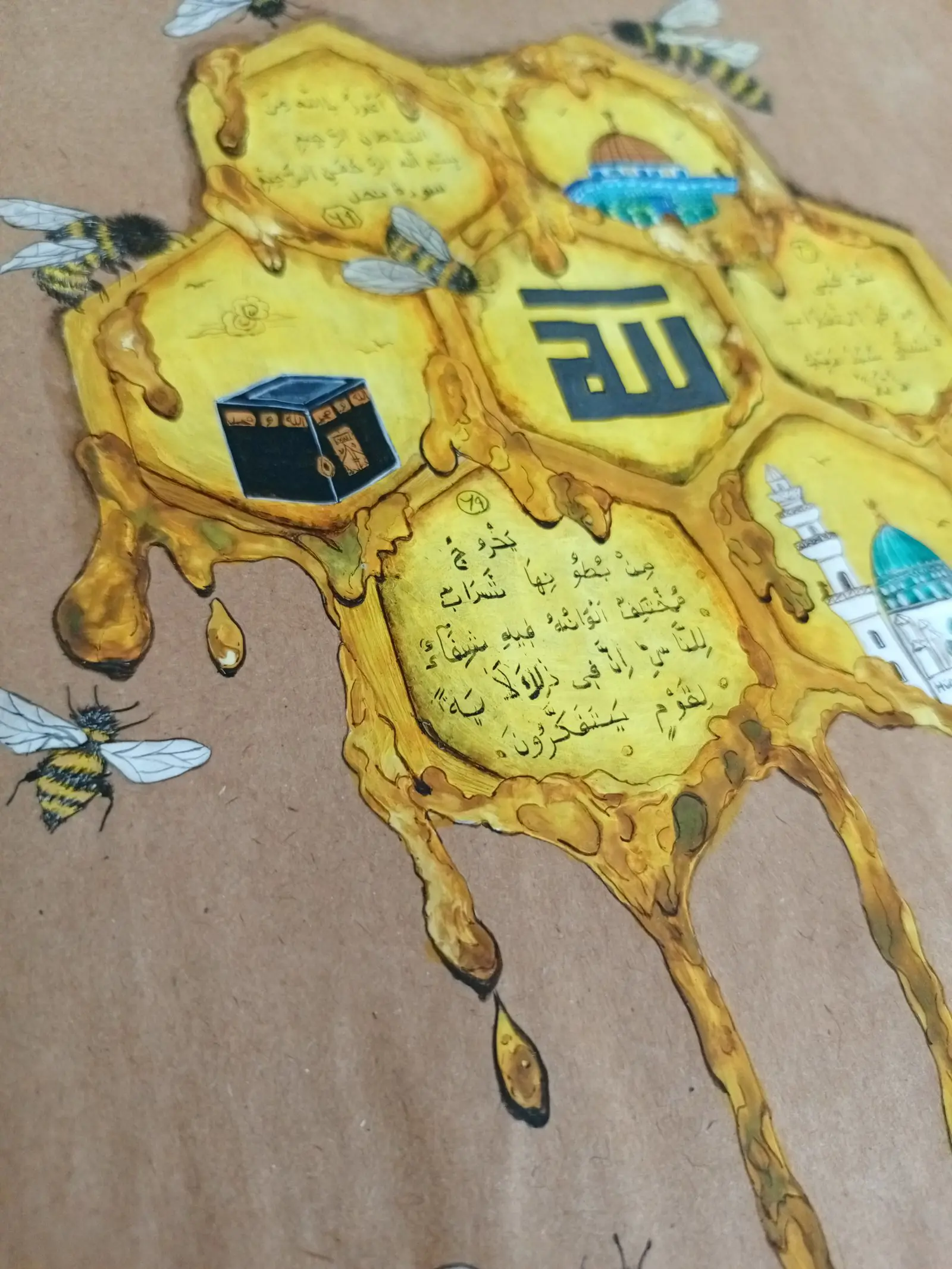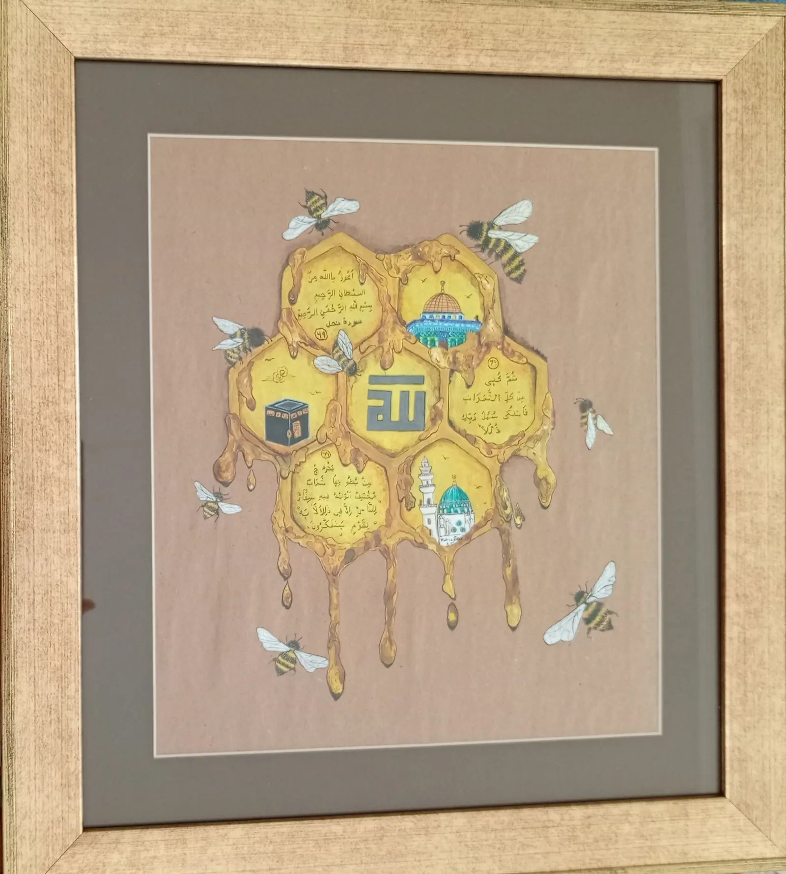 Balın şifasını anlatan bu ayet, insana hem bedenin hem de ruhun iyileşeceği kaynağı fısıldar. Bu eserimde, şifanın merkezine kalbin ilacı olan Allah lafzını yerleştirdim; etrafını ise, ruhun sükûn bulduğu mekânlarla çevreledim.