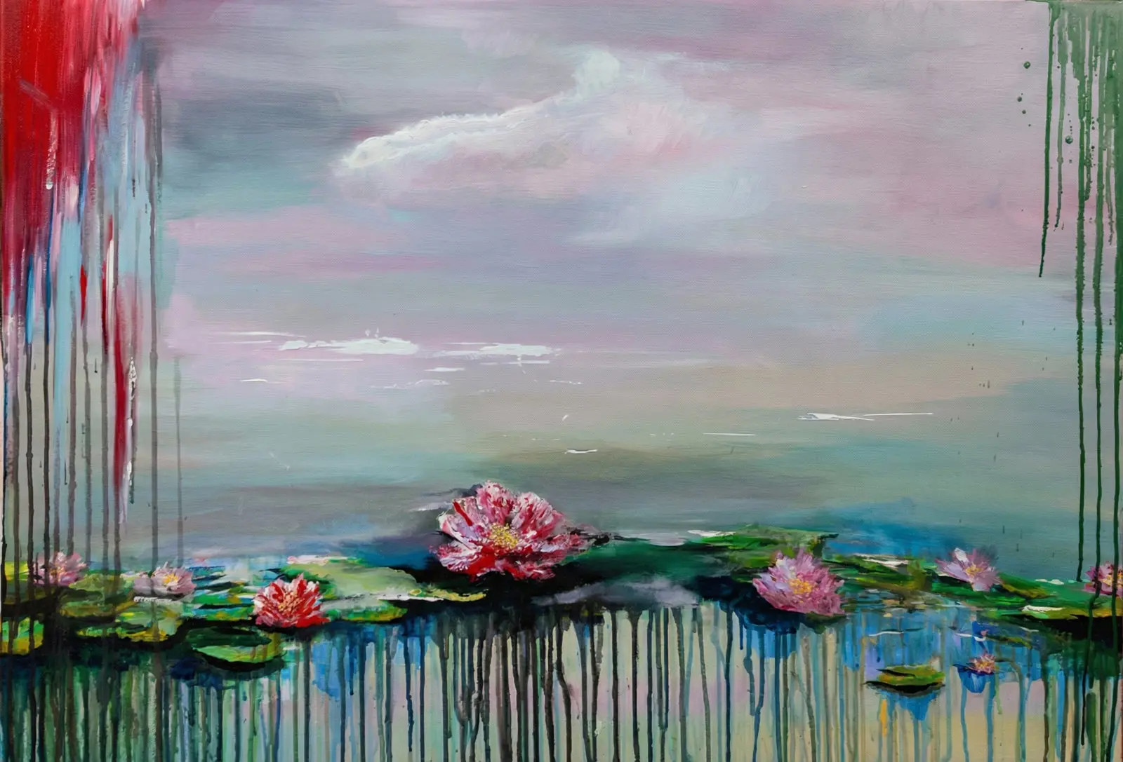 Sekiz nilüfer, dingin bir su yüzeyinde yaşamın sürekliliğini ve umudu simgeler. Gökyüzüyle bütünleşen kompozisyon, soldan kırmızının tutkusu ve sağdan yeşilin doğallığıyla dengelenir. Akan boyalar, kontrol ile özgürlüğün buluşmasını anlatırken, eser izleyiciye pozitif enerji ve içsel bir sakinlik sunar.
