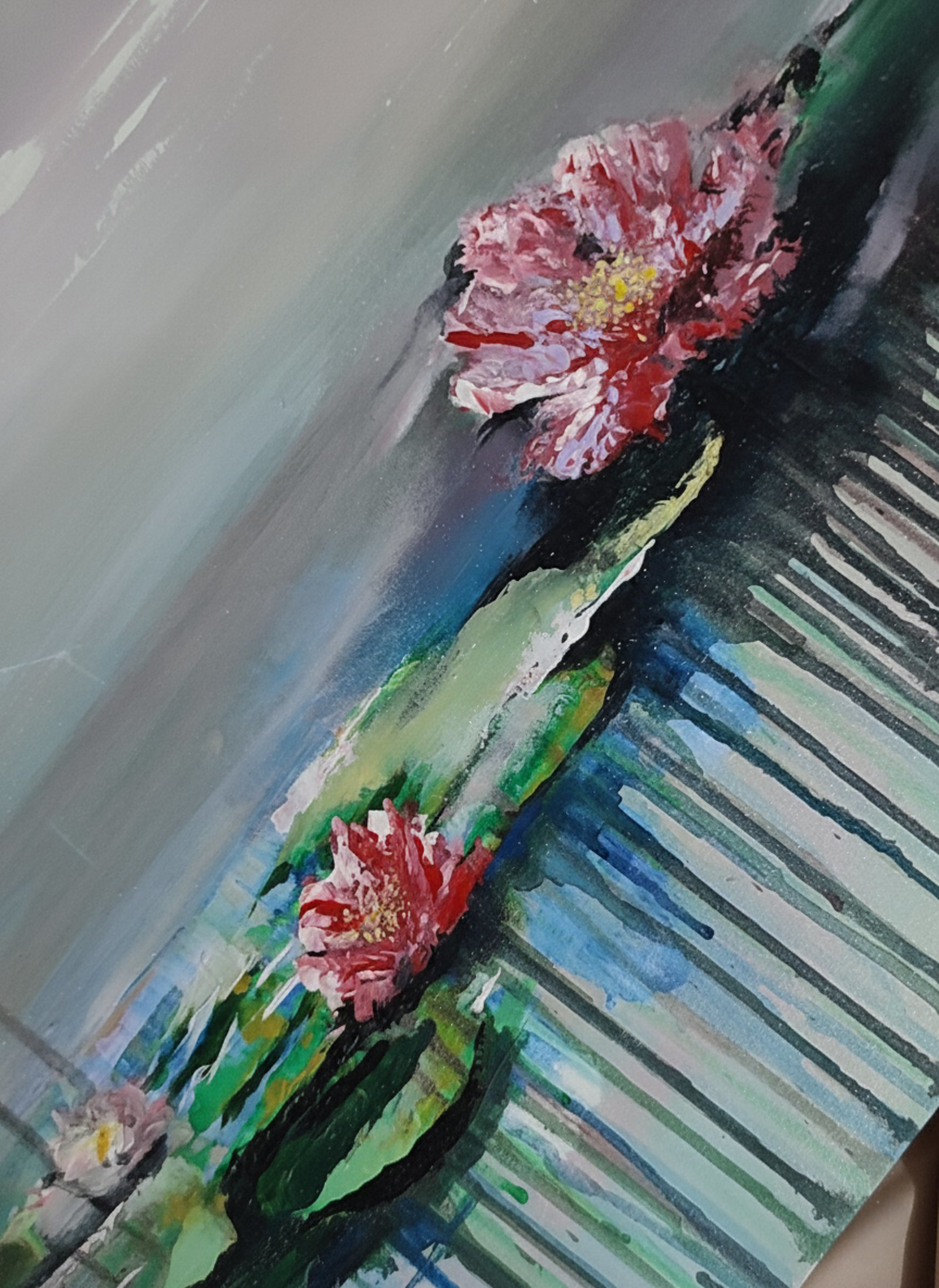 Gökyüzü, su yüzeyi, nilüfer yaprakları ve sekiz çiçekten oluşan bu özgün tablo, modern ve enerjik bir yorum sunar. Ev ve ofis dekorasyonuna canlılık katar.