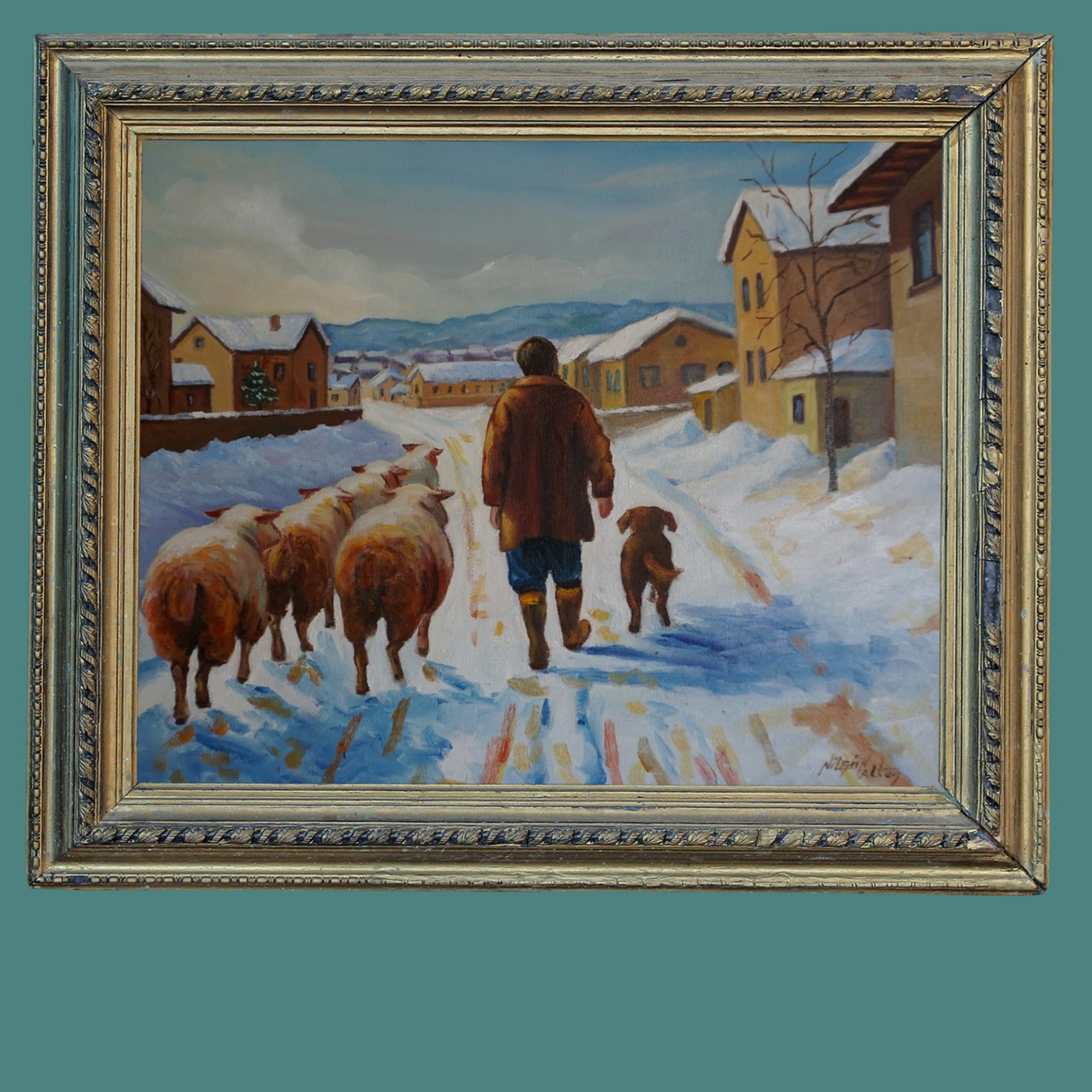 Bu çalışma, figürleri arkadan kurgulayarak izleyiciyi sahnenin içine çeken güçlü bir anlatı kuruyor. Soğuk kış paleti, sıcak toprak tonlarıyla dengelenmiş; fırça vuruşları yürüyüşün ritmini ve sessizliği hissettiriyor. Günlük hayatın yalın ama derin bir anını taşıyan, zamansız ve koleksiyon değeri yüksek bir eser.