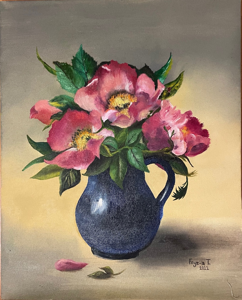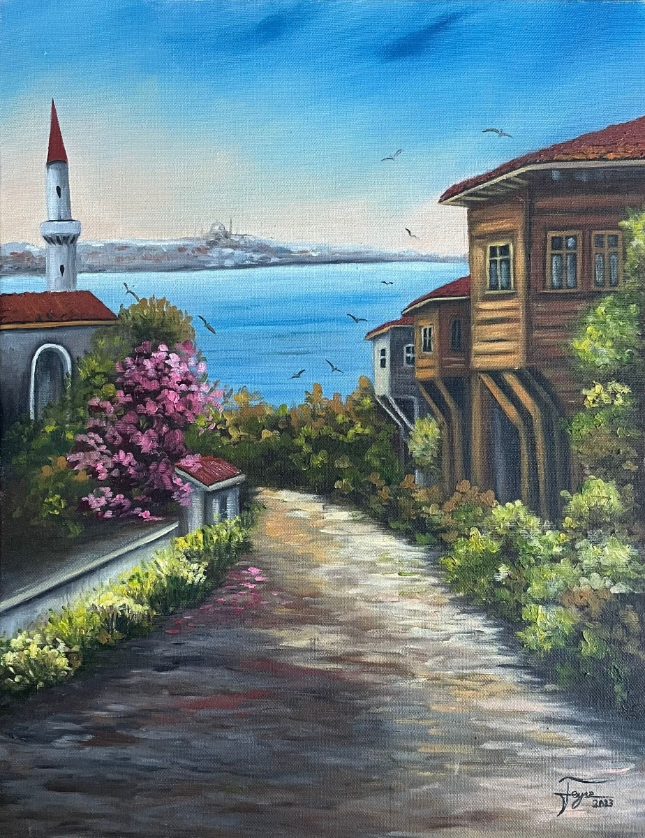 Resim astarlanmış yüksek kaliteli %100 pamuk tuval üzerine işlenmiştir. Vernikli ve çerçeveli haldedir.