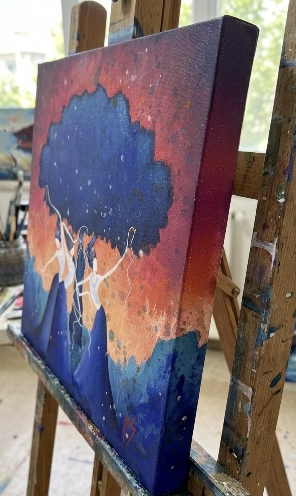 Resim, karanlığın içinden doğan bir umudu ve kadın ruhunun engellenemez coşkusunu simgelemektedir. Birlikte el ele, ritmin ve hakikatin peşinde koşan kadınlarİn zafer dansıdır.