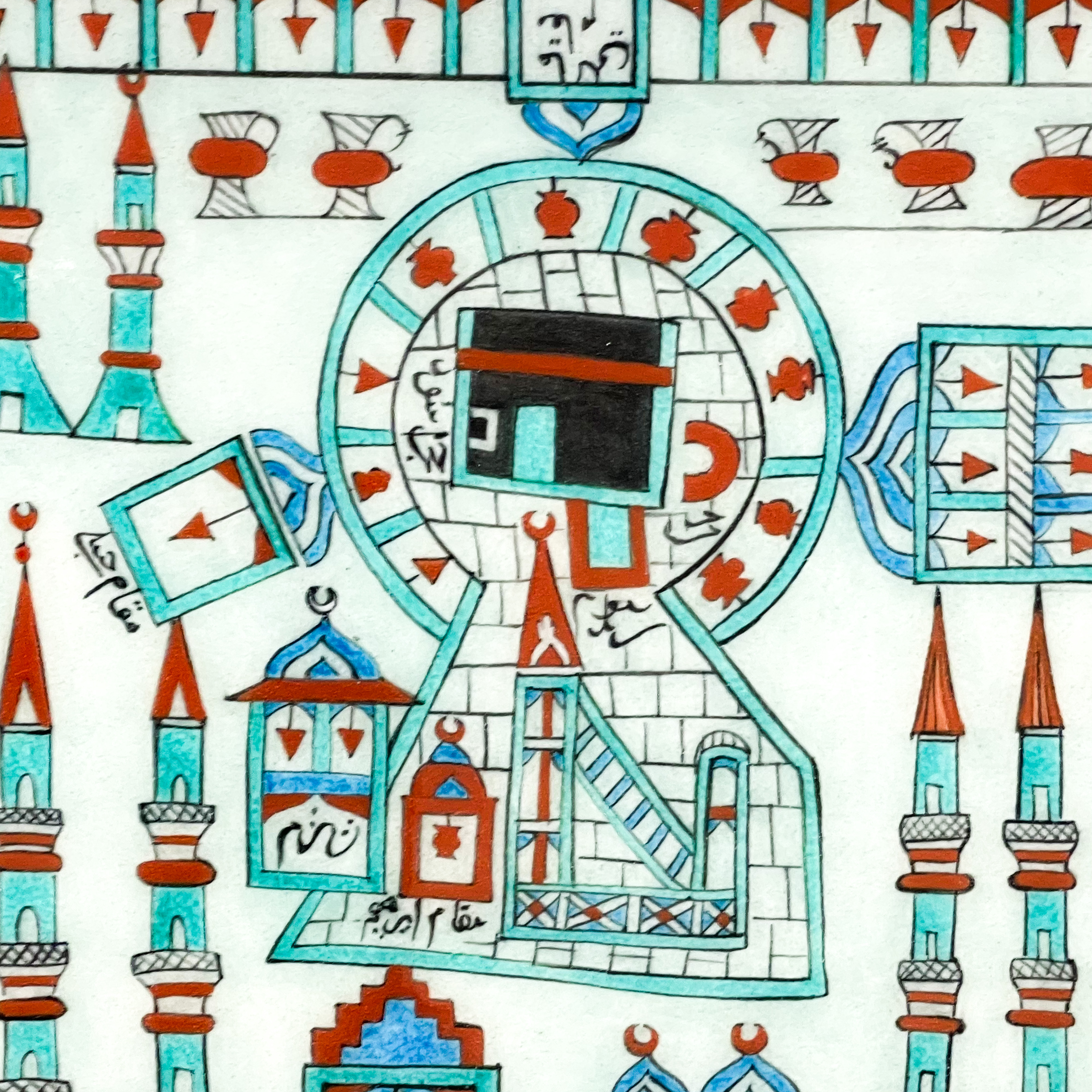 Malezya İslam Sanatları Müzesi koleksiyonunda bulunan çini pano, 2012 yılında Christies Müzayede’den satın alınmıştır. Sıraltı boyama tekniğinde işlenmiş olan panoyu içinde kandiller bulunan revaklı avlu çevrelemektedir. Anahtar deliği formu içinde Kâbe, etrafında Hanefi, Şafi, Maliki ve Hanbeli makamları, minber, yedi minare ve zemzem kuyusu betimlenmiştir. 17. yüzyıl İznik üretimidir. Eser, orijinalinin 2026 yılında yapılmış replikasıdır.