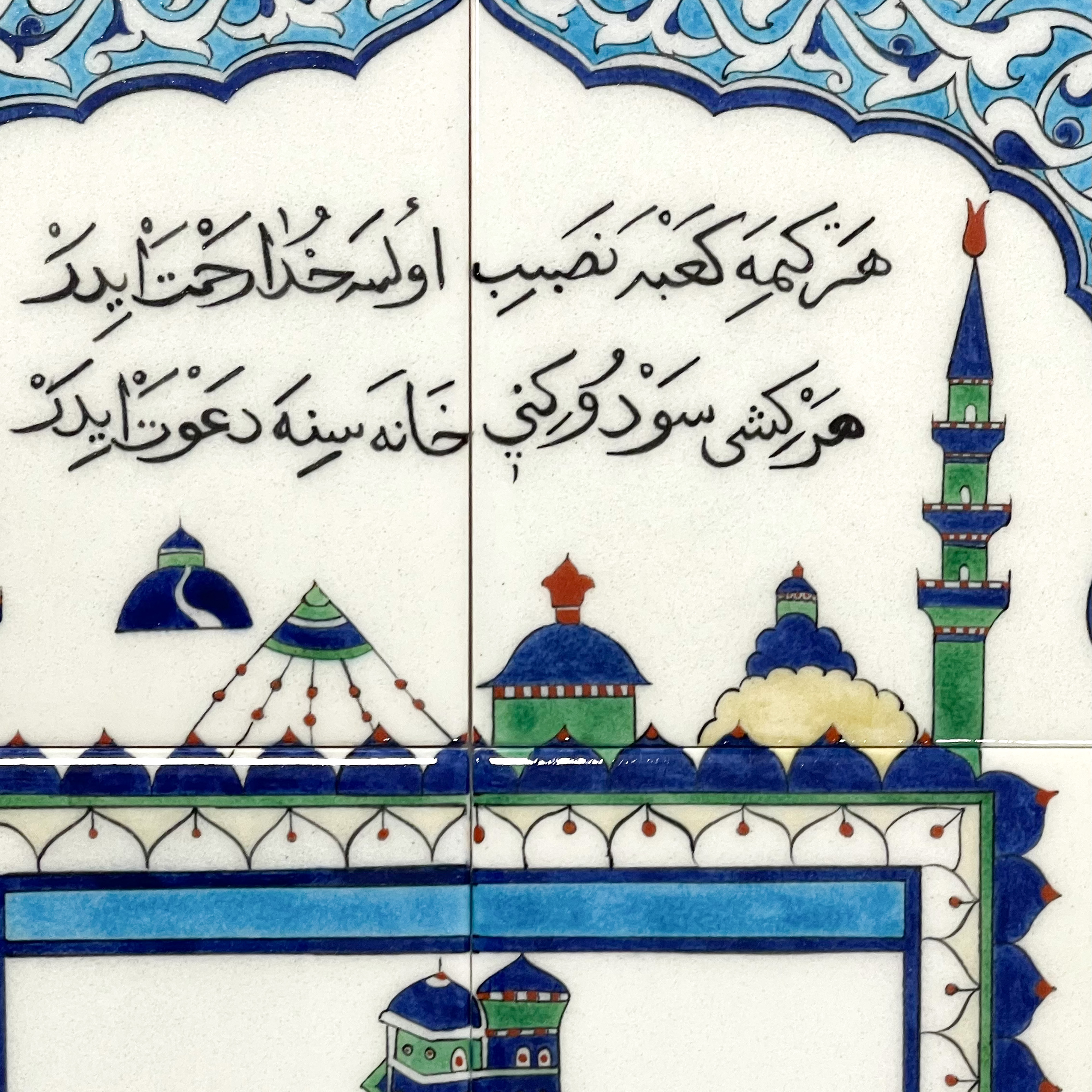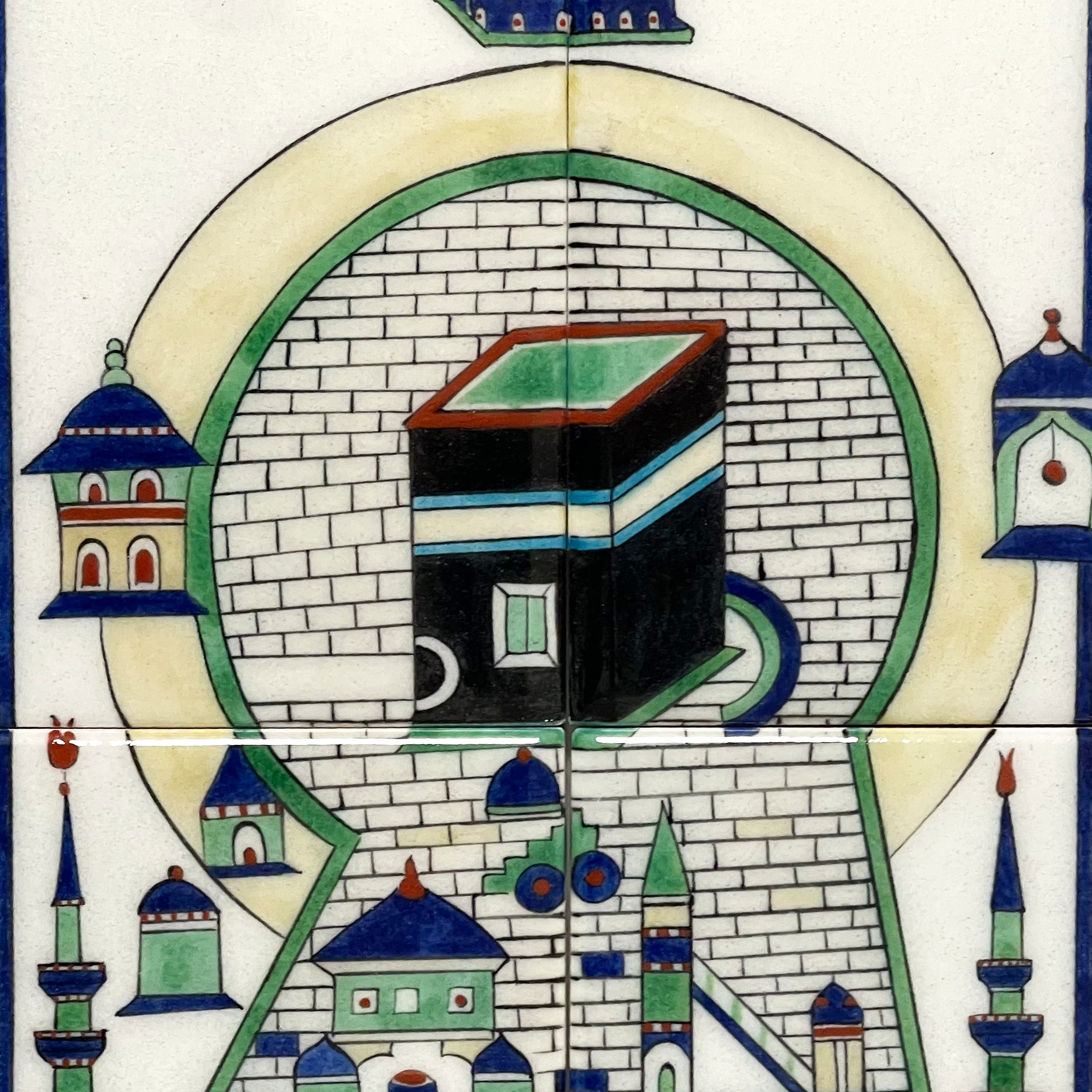 Louvre Müzesi koleksiyonunda 3919-2-242 envanter numarası ile yer alan çini panonun 19. Yüzyılın son çeyreğinde Albert Sorlin Doringy tarafından müzeye satıldığı bilgisi belirtilmektedir. Altı karodan oluşan çini pano sıraltı boyama tekniğinde işlenmiş olup etrafını sivri kemer formunda motiflerden oluşan ince bir bordür çevrelemektedir. İçleri rumi motifleri ile bezeli turkuaz zeminli köşebentlerin ortasında siyah yazı ile “Her kime Kâbe nasip olursa Hüdâ rahmet eder, Her kişi sevdiğini hanesine davet eder” ibaresi yer almaktadır. Anahtar deliği formu içinde üç boyutlu olarak Kâbe, etrafını çevreleyen revaklı avlu, yedi minare, mezhep makamları, minber, Hacer-ül Esved betimlenmiştir. 17. yüzyıl İznik üretimidir. Eser aslının birebir replikası olarak çalışılmıştır.