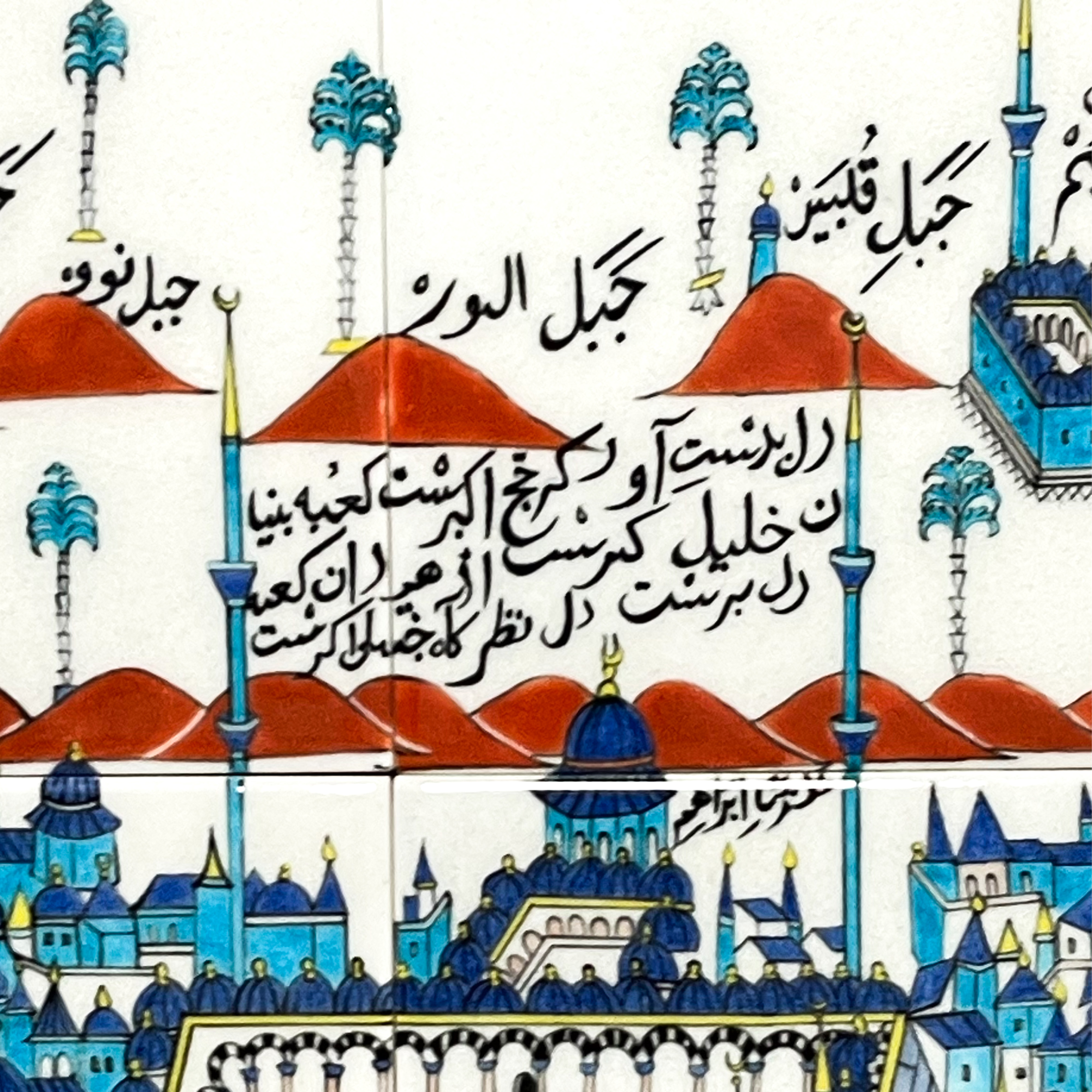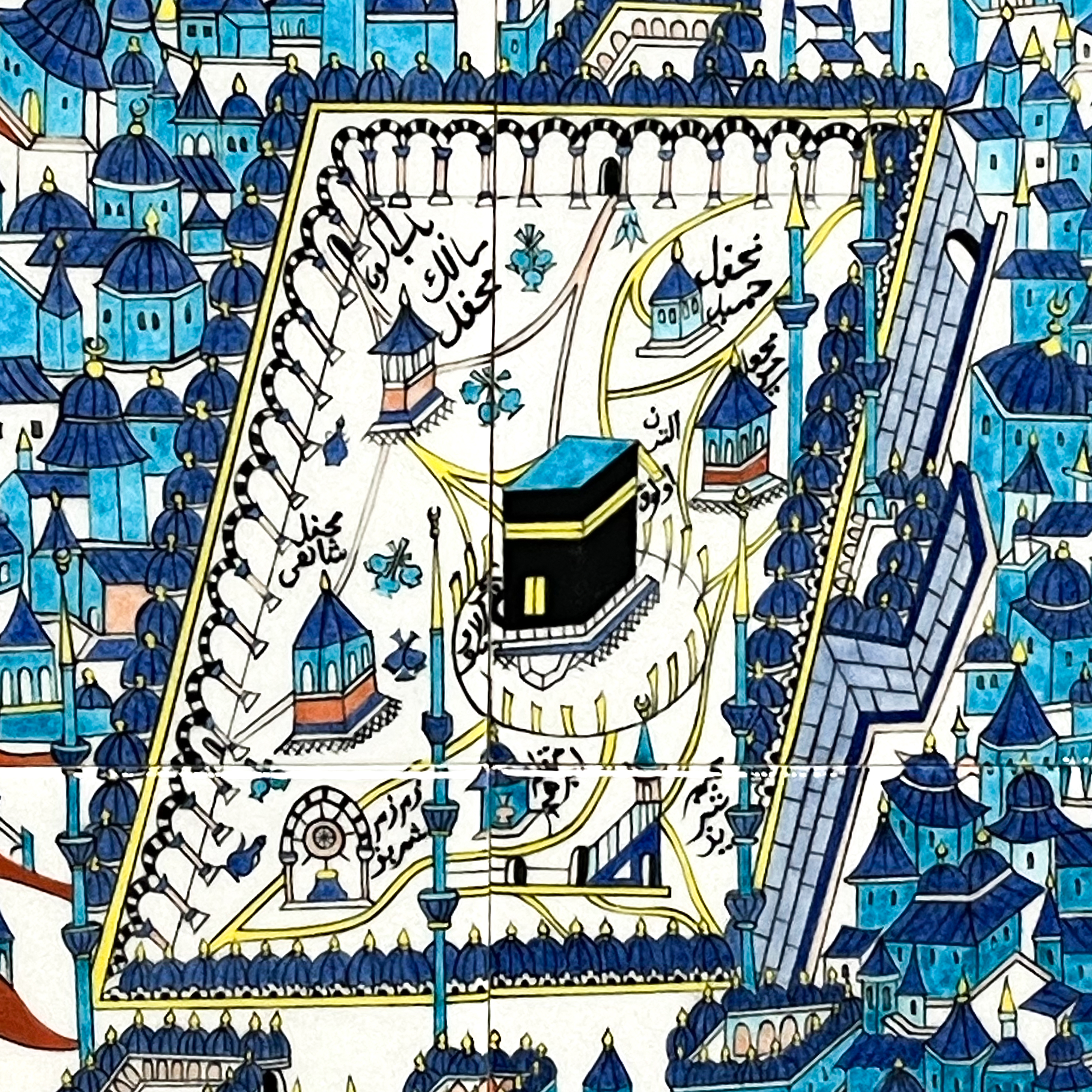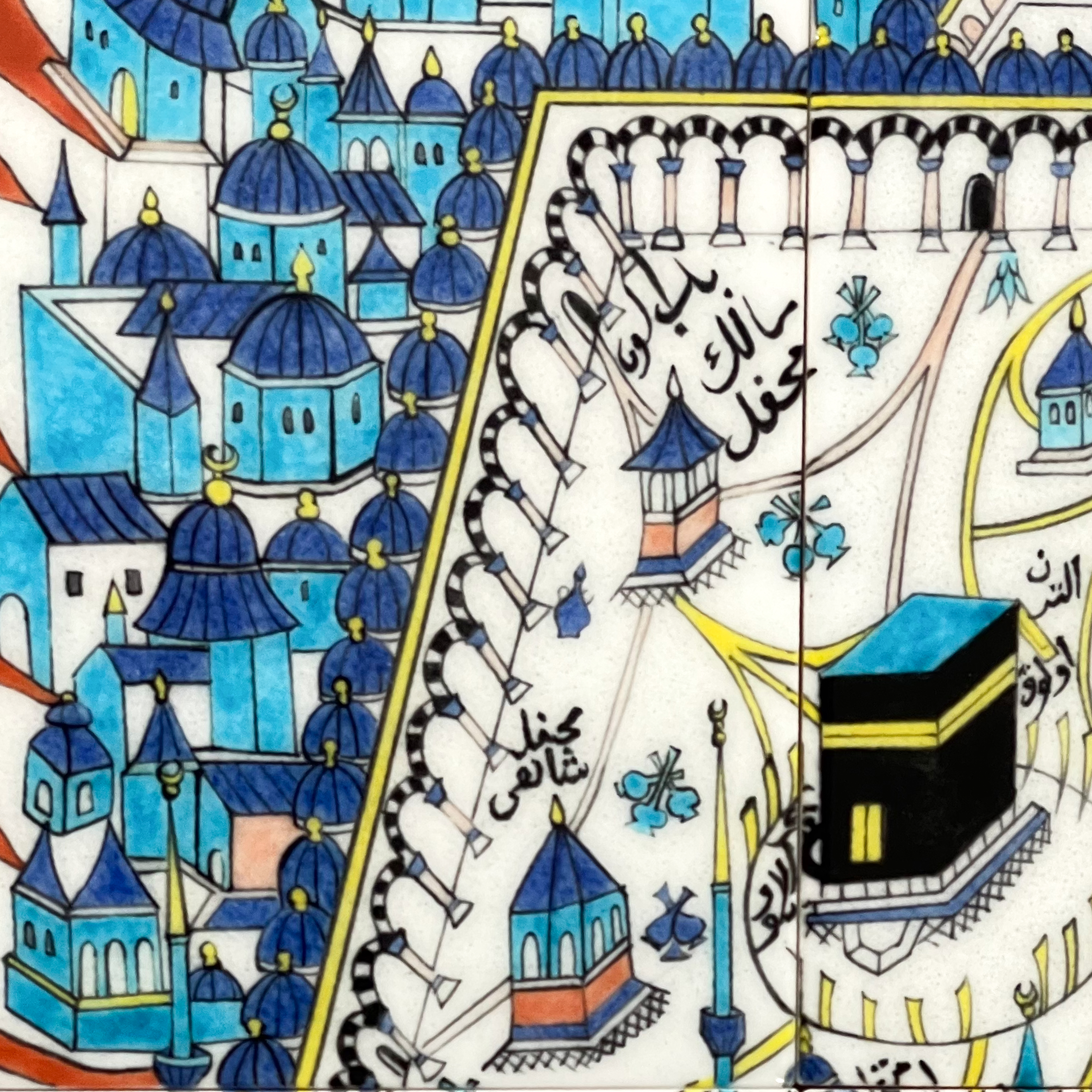 Kahire İslam Eserleri Müzesi’nde 1394-1726M envanter numarası ile kayıtlı olan çini pano, sıraltı boyama tekniğinde işlenmiş olup 18. Yüzyıl Tekfur Sarayı atölyeleri üretimidir. Panonun etrafını üç iplik rumi tarzında ince bir bordür çevreler. Mescid-i Haram’da bulunan Kâbe ile çevresindeki kubbelerle örtülü revaklı avlu, mezhep binaları, minber gibi yapılar perspektifli olarak yer alır. Üstte Mekke’nin çevresindeki dağlardan Cebel-i Arafat, Cebel-i Sevr, Cebel-i Kubeys tasvir edilmiştir. Dağların arasındaki yazıda Hazret-i Mevlana’ya ait “Dil bedest-âver ki hacc-ı ekberest, Ez hezârân Kâ’be yek dil bihterest, Kâ’be bünyâd-ı Halîl-i Âzerest, Dil nazargâh-ı Celîl-i Ekberest” ifadesi bozuk bir yazıyla yer almaktadır. Sol alt köşede kartuş paftası içinde yapan ustanın adı “Mehmet el-Şamî 1394(1726)” olarak yazmaktadır. Sağ köşedeki Mescid-i İbrahim ve dağlar arasındaki hurma ağaçları ile Mekke şehrinin panoramik bir yansıması gibidir. Eser aslının birebir replikası olarak çalışılmıştır.