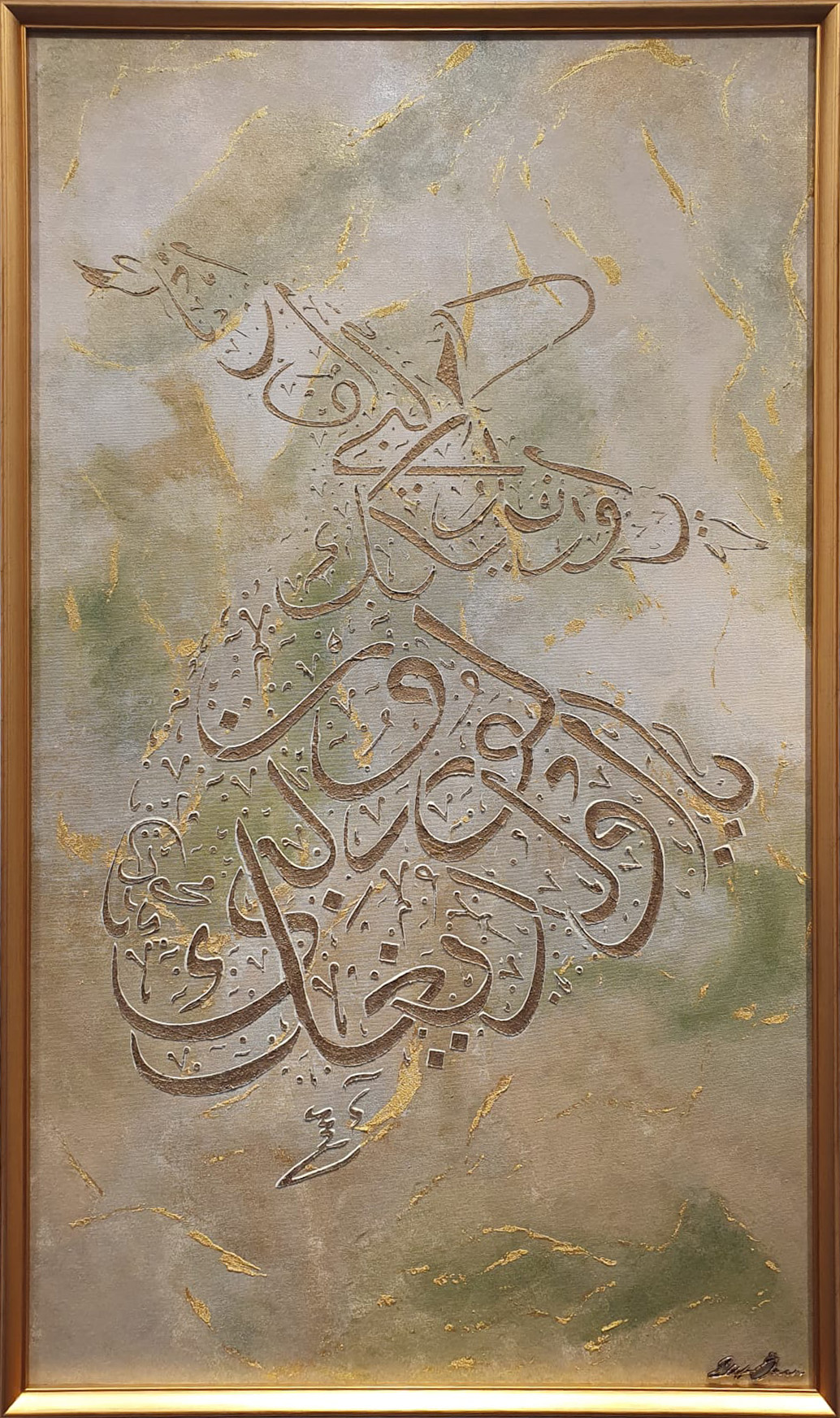 Profesyonel tuval üzerine akrilik boya ve dokulu hat çalışması yapılmıştır. "Ya gafurezzunub gufraneke" "Ey günahları bağışlayan bağışlaman dilenir." yazmaktadır.