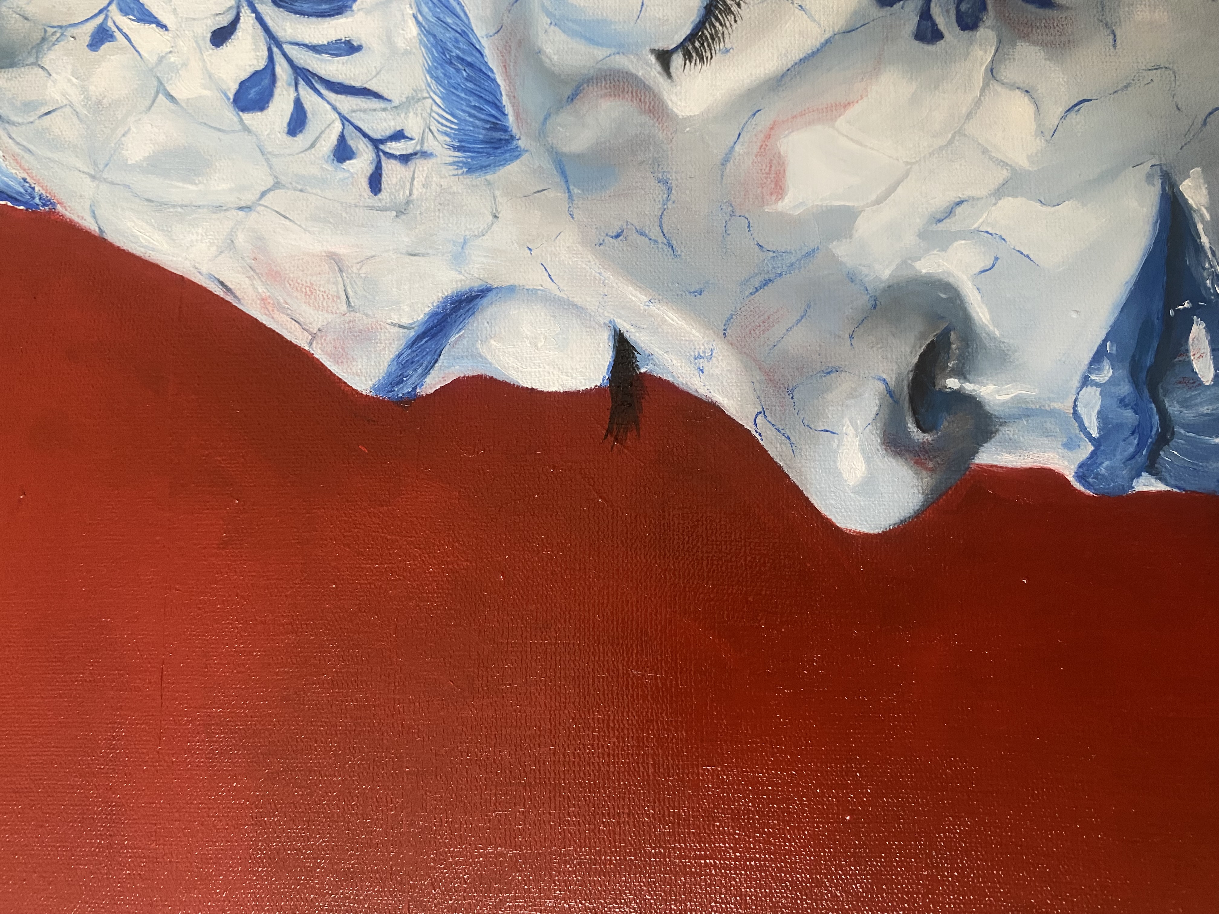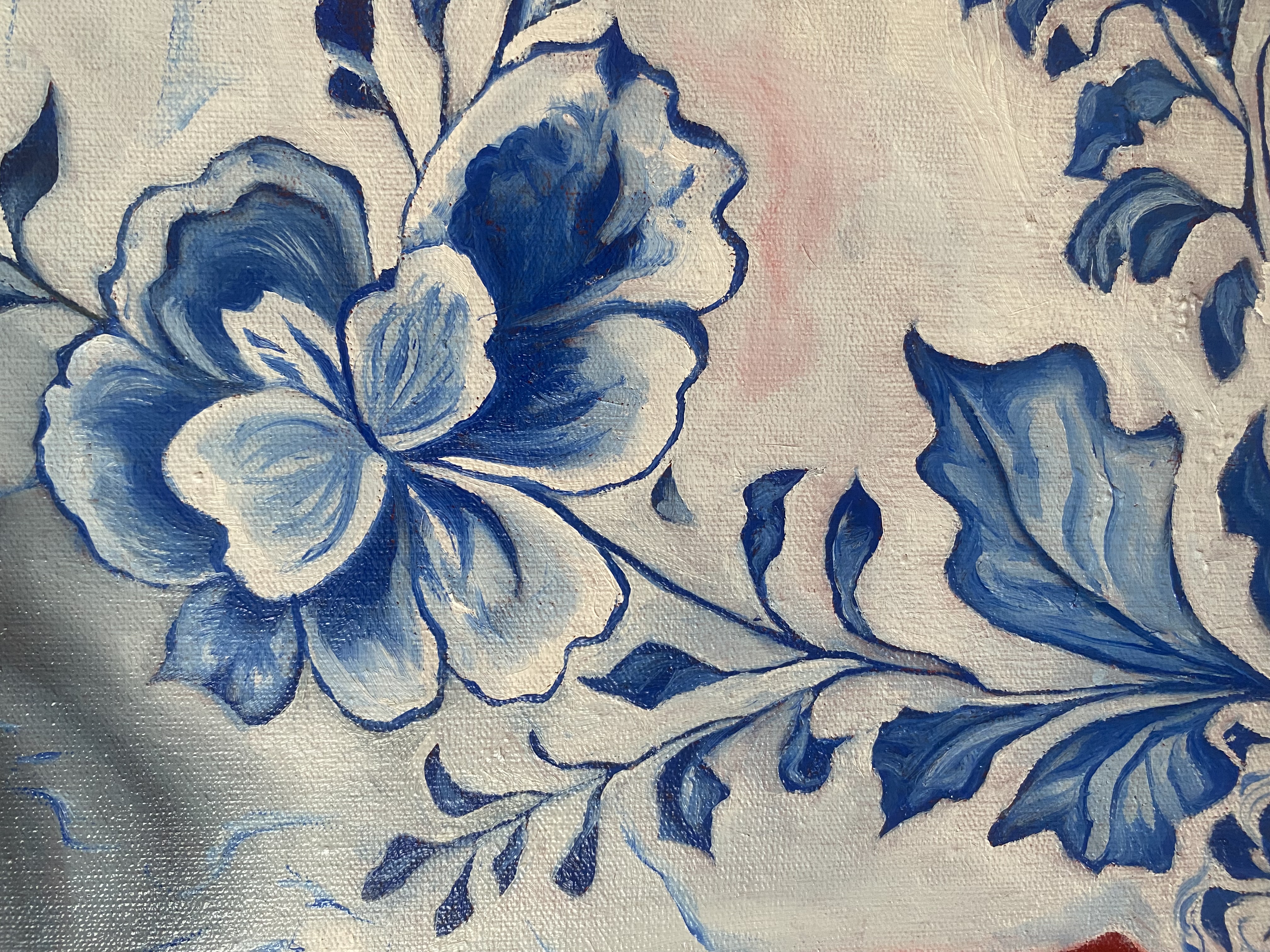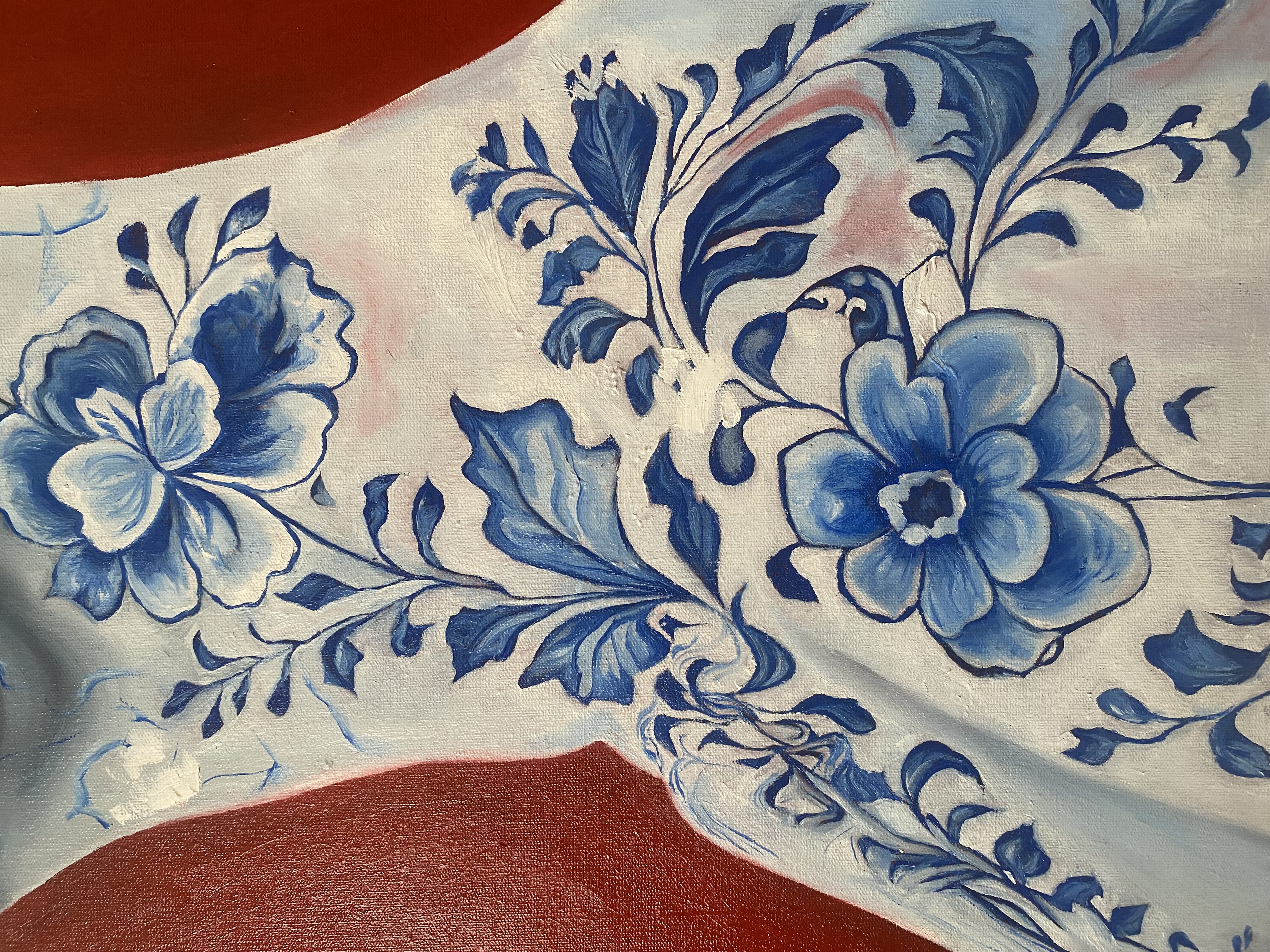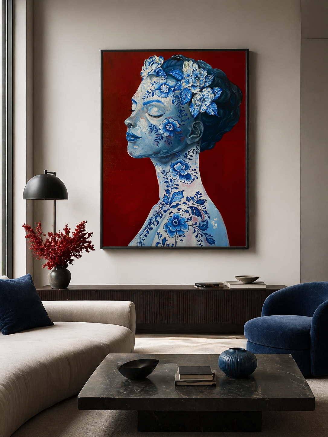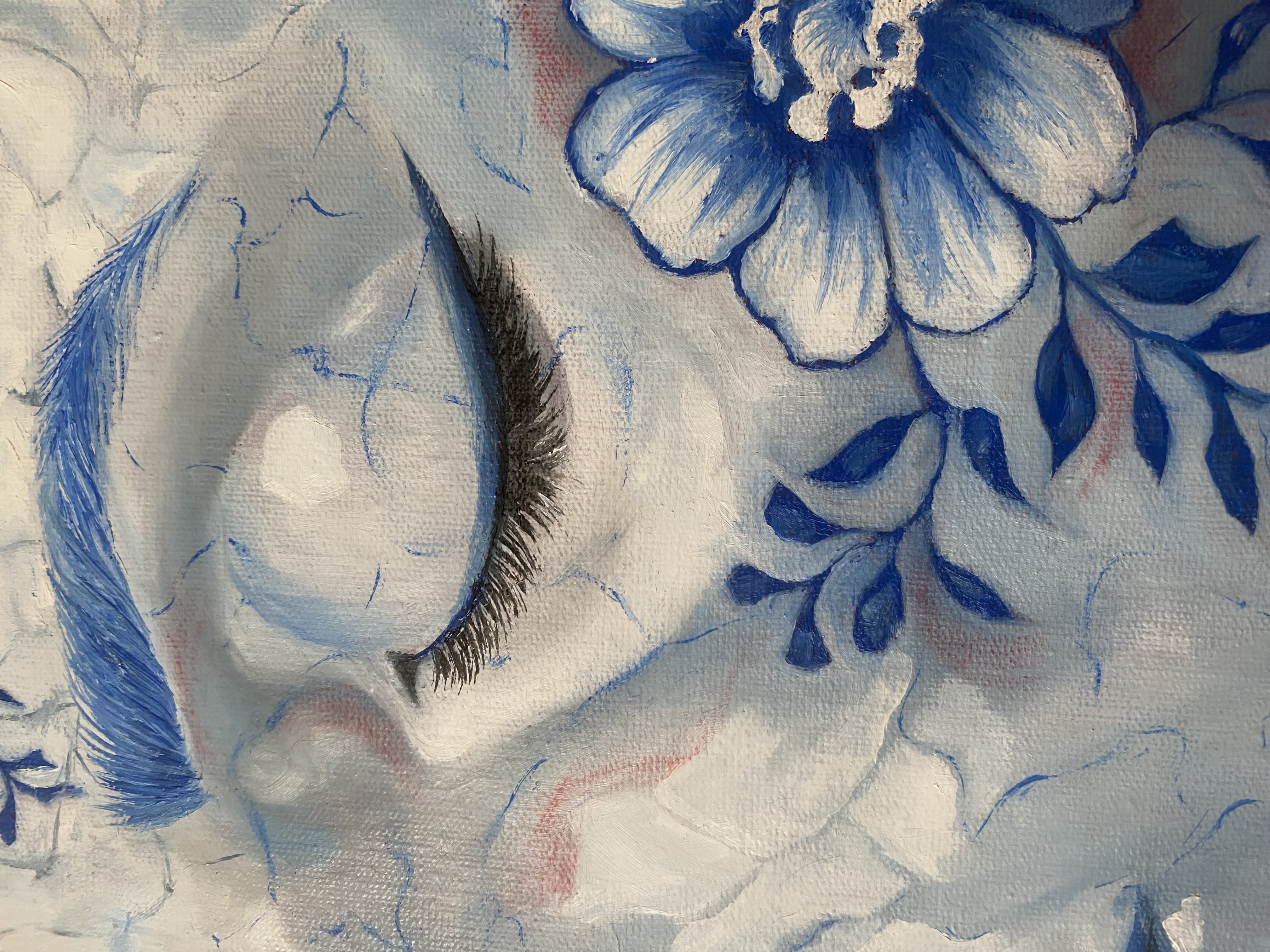 Bu yağlı boya çalışmada, porseleni andıran bir yüzeye sahip huzurlu bir kadın profili yer alır. Yüzeyindeki mavi çiçek motifleri estetik bir bütünlük sunarken, ince çatlaklar içsel kırılmaları ve görünmeyen duygusal izleri temsil eder.